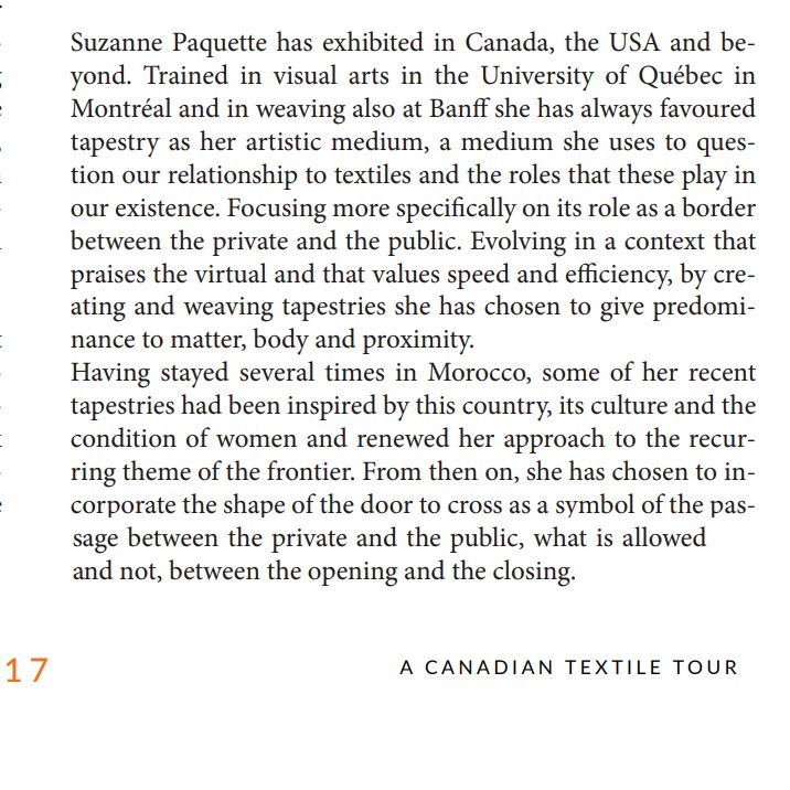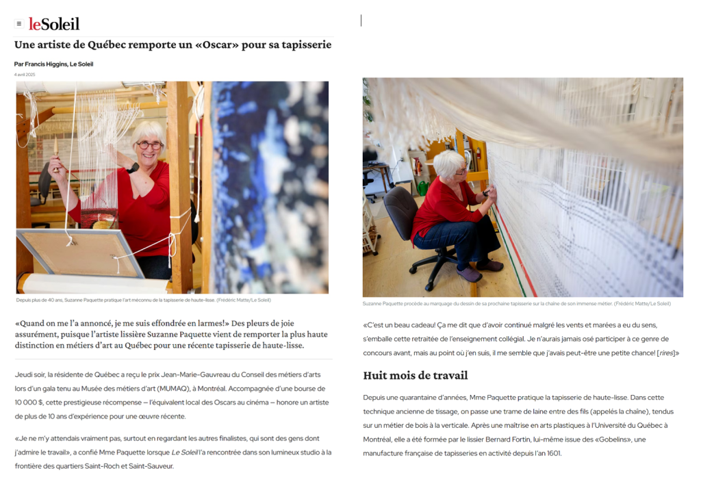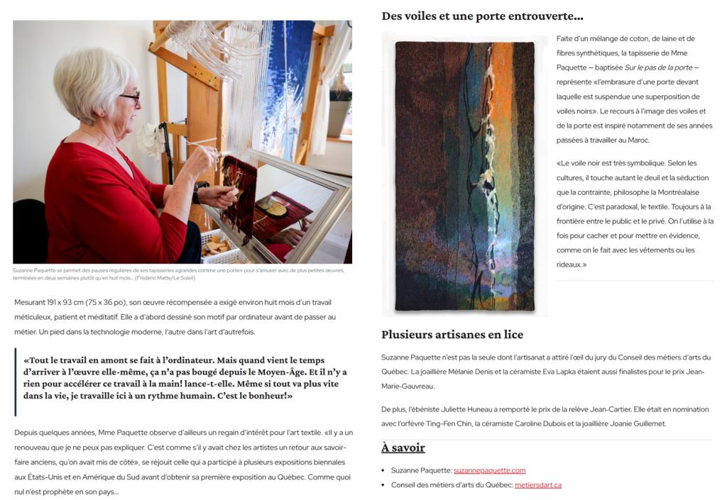 Dans la version électronique de plusieurs journaux du Québec ont publié l’article intitulé «Le tissage à la verticale, un art immémorial avec Suzanne Paquette» qui invite les lecteurs à visionner ma capsule vidéo sur la plate-forme de la Fabrique Culturelle.