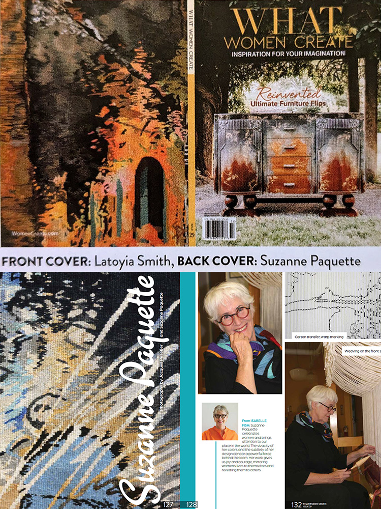 Un article de 12 pages, des images de ma tapisserie Œuvre de femmes dans les pages de garde et une image de ma tapisserie Fractures sur la couverture arrière.